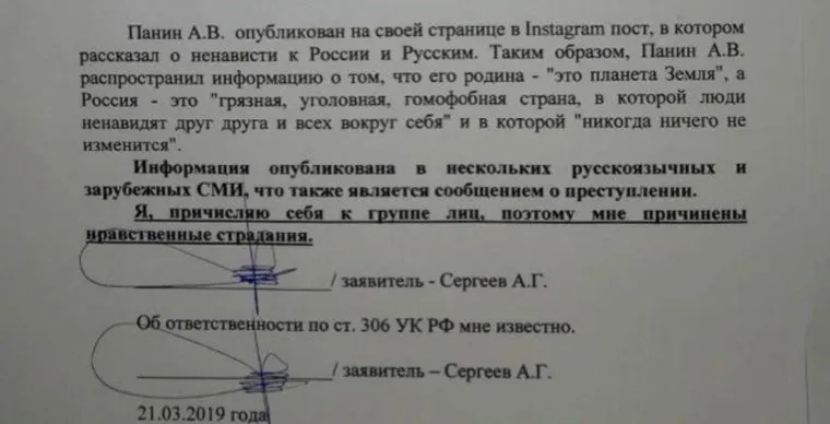 «Информация [о высказываниях Панина] была опубликована в нескольких русскоязычных и зарубежных СМИ, что также является сообщением о преступлении», — написал адвокат. Он также подчеркнул, что своей публикацией актер Панин причинил ему нравственные страдания. За подобные высказыванию Алексею Панину может грозить наказание в виде лишения свободы сроком от трех до шести лет, предусмотренное статьей 282 УК РФ «Возбуждение ненависти либо вражды, а равно унижение человеческого достоинства».