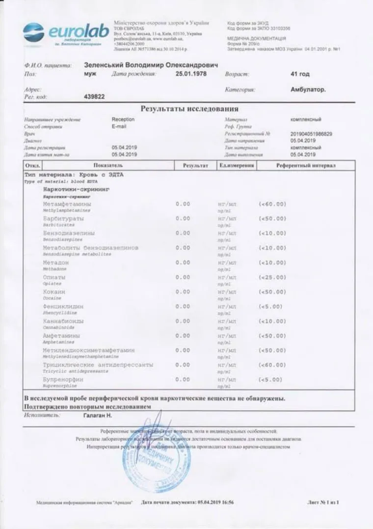В крови комика и кандидата в президенты Украины Владимира Зеленского не нашли следов алкоголя и наркотиков. Результаты анализов шоумен опубликовал на своей странице в Facebook (деятельность запрещена в РФ).