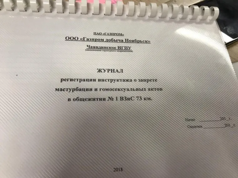 Жильцам общежития одного из нефтегазовых предприятий Ямала запретили мастурбировать и совершать гомосексуальные акты. Там даже завели журнал инструктажа о введенном запрете, сообщил в социальных сетях анонимный автор, опубликовавший фото в одном из пабликов Ноябрьска во «ВКонтакте».