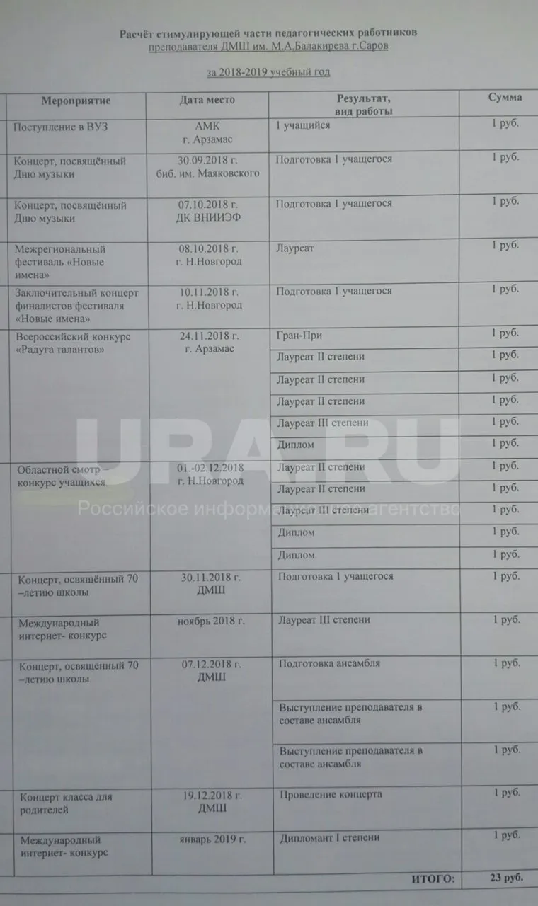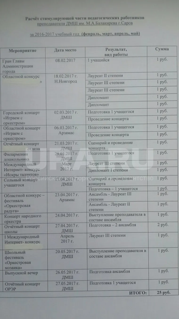 Исполняющая обязанности директора школы Анастасия Гусева выплатила педагогам стимулирующие премии. Так, Синицкая получила 80 рублей за 17 месяцев работы. За подготовку и выступление подопечных на областных, всероссийских и международных музыкальных конкурсах учителям выдавались премии в рубль или два. Такие данные следуют из документов, которые есть в распоряжении «URA.RU».