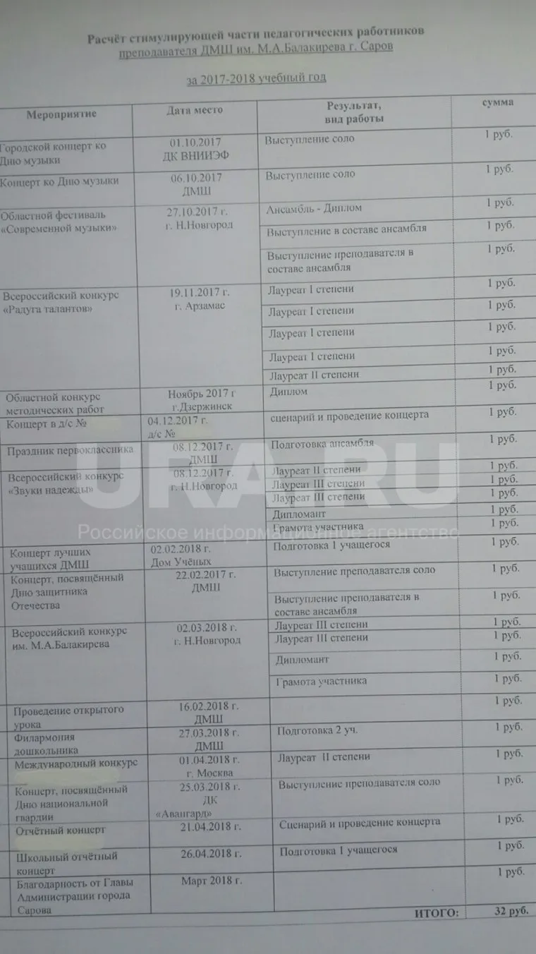 В Сарове Нижегородской области преподаватель музыкальной школы имени Балакирева Юлия Синицкая за 17 месяцев работы получила 80 рублей стимулирующих выплат. По ее словам, педагоги заведения в течение двух лет не получали никаких премий, поскольку директор школы говорила, что на это денег нет.