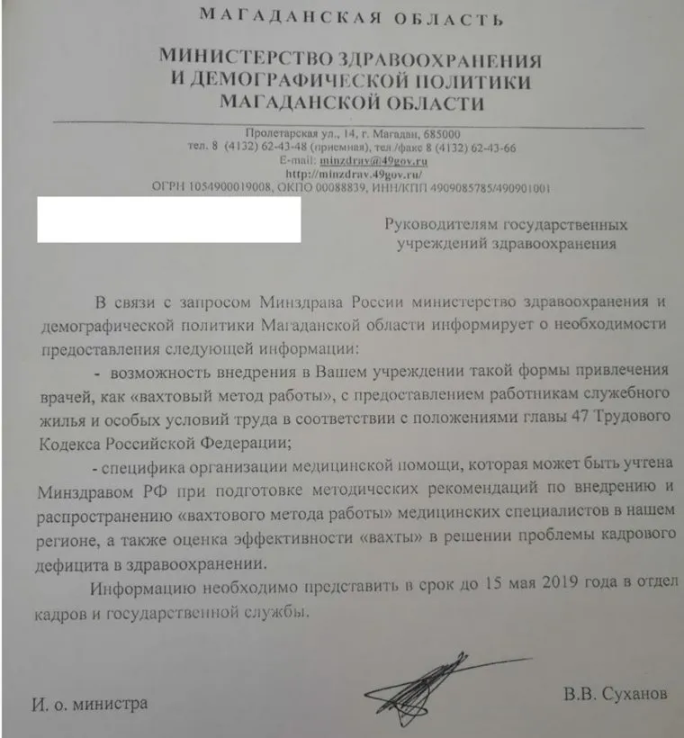 «Министерство здравоохранения Колымы просит предоставить информацию о возможности привлечения врачей „вахтовым методом“», — пишет местное издание vesma.today. Из документа, опубликованного изданием, следует, что минздрав Магаданской области консультируется с руководителями местных больниц по вопросу внедрения в регионе «врачебной вахты». В частности, медработников хотят обеспечить служебными квартирами и «особыми условиями труда». Главврачи должны до 15 мая дать региональному минздраву ответ. Ведомство объясняет свою инициативу «запросом Минздрава России».