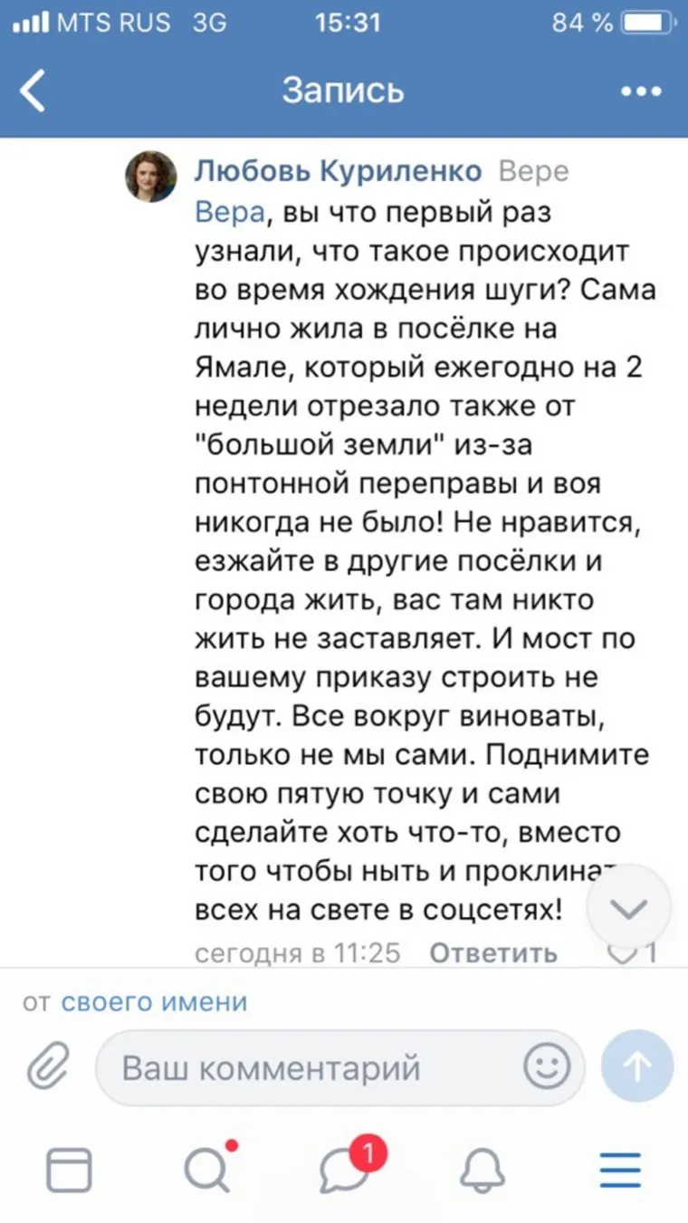 «На майских праздниках в паблике „Глава в районе“ был выложен пост, где администрация предупреждала жителей сел Лямина и Сытомино о том, что понтонная переправа, которая связывает эти поселения с „большой землей“, временно закрыта из-за ледохода. Кто-то из жителей начал возмущаться. Чиновница ответила людям в грубой форме, началась перепалка, в итоге весь ход беседы был удален, а комментарии закрыты», — рассказал в беседе с корреспондентом «URA.RU» житель Сургутского района, пожелавший остаться неизвестным.