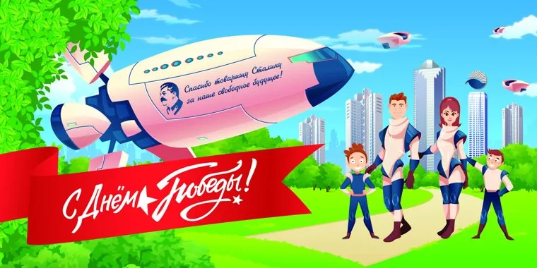 Баннер появился на Пролетарском проспекте в преддверии 9 Мая. Установили его общественники из организации «Работающая молодежь Сибири». На плакате изображены мультяшная семья и космический корабль с портретом Сталина. «Мы попытались связать наше прошлое и будущее», — сообщается на официальной странице организации во «ВКонтакте».
