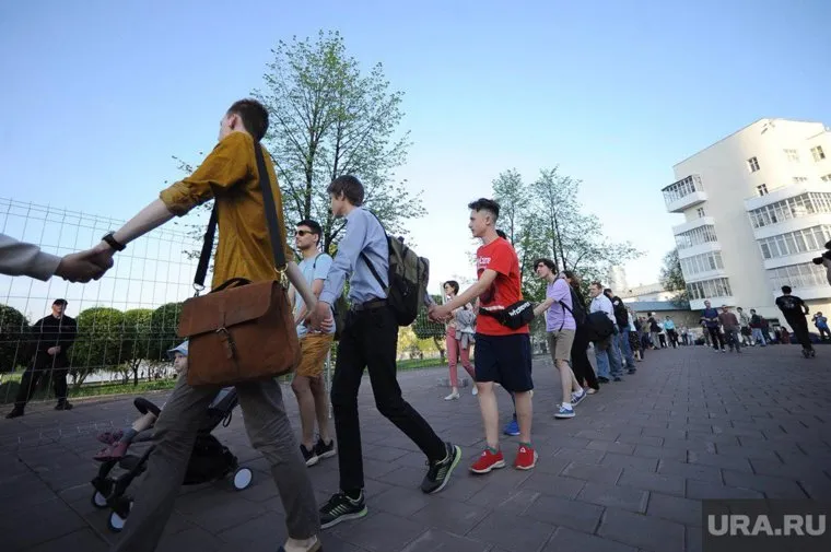 Не вошедшие в живое кольцо участники акции толпятся около установленного вокруг стройплощадки забора со стороны театра драмы. Некоторые противники храма пытаются эмоционально завести толпу. «На Ботанике нет храма, на Вторчермете нет. Большакова, Белинского, Фурманова — там идеальное место», — прокричал один из активистов, надевший кепку с символикой «Единой России». Затем толпа начала вместе кричать: «Позор!»