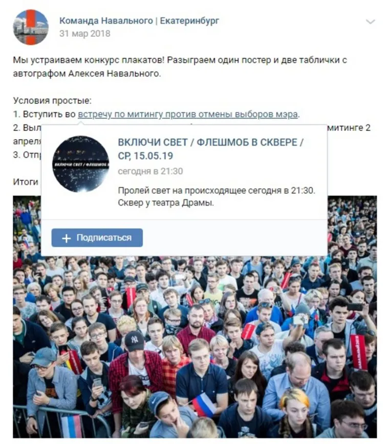 Флешмоб «Включи свет», который готовится 15 мая на Октябрьской площади Екатеринбурга, где планируется строительство храма Святой Екатерины, организует екатеринбургский штаб оппозиционера Алексея Навального. Страница мероприятия во «ВКонтакте» была создана с помощью пустого аккаунта «Еще один?». Если открыть упоминания страницы флешмоба, то появляется целый ряд публикаций о митинге против отмены прямых выборов мэра Екатеринбурга в апреле 2018 года, организатором которого выступал местный штаб Навального.