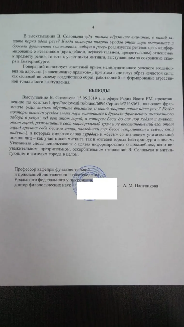 «Выступление Владимира Соловьева включает фрагменты, в которых имеются слова „уроды“ и „бесы“ со значением унизительной оценки лиц — как участников митинга, так и жителей города Екатеринбурга в целом. Указанные слова использованы с целью информирования о враждебном, явно неуважительном, презрительном, оскорбительном отношении Владимира Соловьева к митингующим и жителям города в целом», — сделали вывод на кафедре лингвистики.