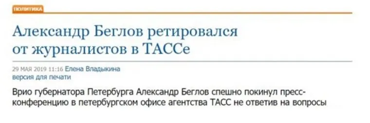 Весной в нескольких петербургских и московских СМИ появились материалы с малопонятной критикой Беглова. Авторы без аргументации и внятных инфоповодов пытались убедить читателей в том, что нынешний врио губернатора — неподходящая кандидатура для управления городом. Отметим, что одно из изданий принадлежит холдингу «Медиа-СПб» Алексея Разорёнова, которого, в свою очередь, неоднократно уличали в информационном рэкете и черном пиаре. Риторику журналистов поддержали и местные оппозиционеры, в частности, представители «Яблока» в Заксобрании Санкт-Петербурга Максим Резник и Борис Вишневский — в социальных сетях оппозиционеры репостят записи друг друга и комментируют посты, создавая видимость интереса аудитории к имиджевым проблемам Беглова. Интересно, что в СМИ, принадлежащих Разорёнову, появляются исключительно хвалебные материалы о Резнике, который ранее оказался в центре наркоскандала — в Сети появилась видеозапись, где он курит самокрутку, предположительно, с запрещенными веществами.
