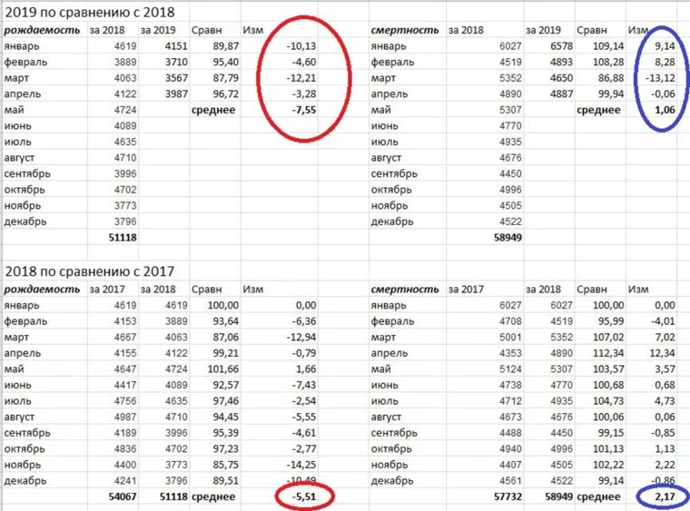 Смертность, наоборот, выросла: за первые четыре месяца 2019-го умерло на 220 человек больше, чем за этот же период 2018 года. таким образом, данный показатель вырос на 1,06%. Впрочем, такие же тенденции были характерны и для прошлого года: в 2018-м по сравнению с 2017-м рождаемость упала в среднем на 5,51%, а смертность выросла на 2,17 процента.