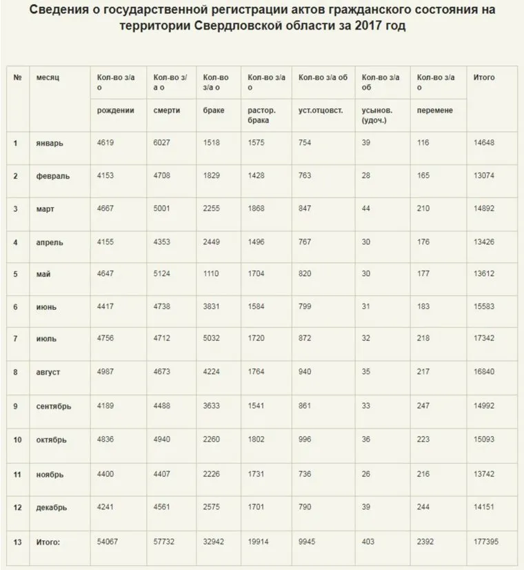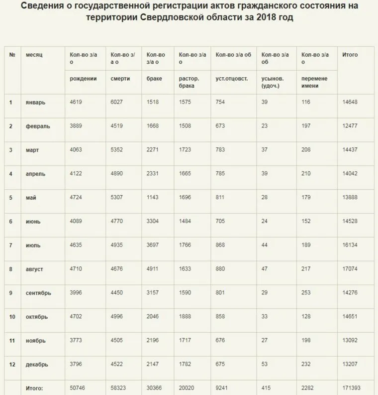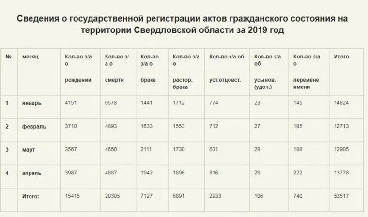 Жители Свердловской области стали реже рожать и чаще умирать — об этом свидетельствует статистика, опубликованная на сайте регионального Управления записи актов гражданского состояния. Согласно данным, рождаемость в первые месяцы 2019 года по сравнению с предыдущим годом упала в январе на 10,13%, феврале — на 4,6%, в марте — на 12,21%, в апреле — на 3,28%.