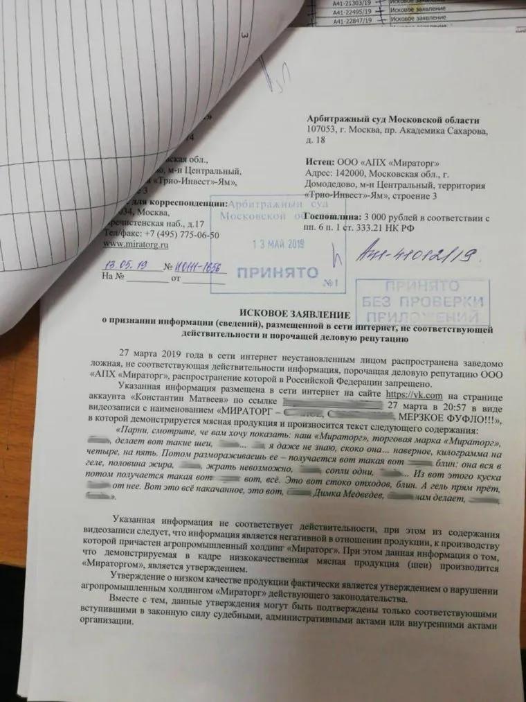 «„Мираторг“ подал два иска о защите деловой репутации», — пишет . Компании не понравилось видео, опубликованное пользователем Константином Матвеевым на личной странице во «ВКонтакте». На кадрах неизвестный мужчина в грубой форме и с использованием нецензурной лексики критикует мясные полуфабрикаты, которые якобы выпустил агрохолдинг.