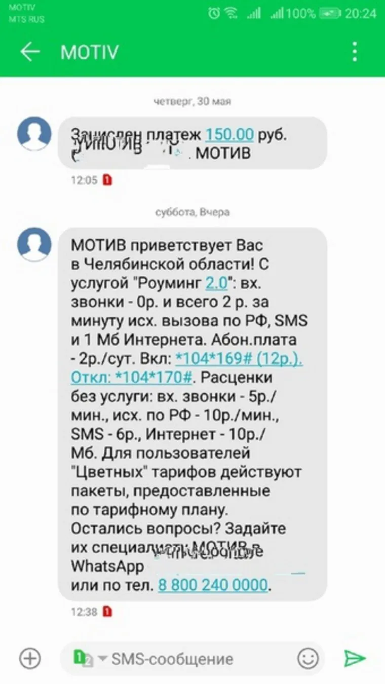 В SMS от оператора «Мотив» клиенту, приехавшему в Челябинскую область, предложили подключить услугу «Роуминг 2.0». Согласно ее условиям, входящие вызовы становятся бесплатными, а исходящие будут стоить два рубля за минуту. Ежедневная абонентская плата за услугу — два рубля в сутки. Также в сообщении от уральского оператора прописано, что без подключения этой услуги входящие звонки будут стоить пять рублей за минуту, а исходящие — десять рублей.