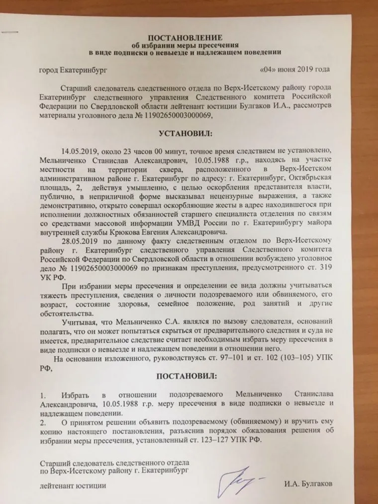 «14.05.2019, около 23 часов… Мельниченко Станислав Александрович, находясь на участке местности на территории сквера… действуя умышленно, с целью оскорбления представителя власти публично в неприличной форме высказывал нецензурные выражения, а также демонстративно, открыто совершал оскорбляющие жесты в адрес находившегося при исполнении должностных обязанностей старшего специалиста отделения по связям со СМИ УМВД России по г. Екатеринбургу, майора внутренней службы Крюкова Евгения Александровича», — говорится в постановлении об избрании Мельниченко меры пресечения (он теперь находится под подпиской о невыезде).