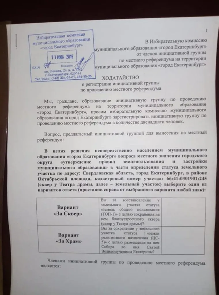 В Екатеринбурге инициативная группа «Комитета защиты сквера» обратилась в городскую избирательную комиссию с ходатайством о проведении референдума. Таким образом они хотят добиться того, чтобы вопрос в итоге рассмотрели депутаты гордумы. В предложенном проекте бюллетеня для голосования только два варианта ответа: «За сквер» или «За храм».