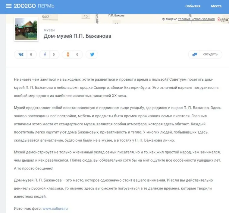 Кроме того, что на портале неверно указано название самого музея, в информации о заведении неоднократно повторяется фамилия «Бажанова». «Не знаете, чем заняться на выходных, хотите развеяться и провести время с пользой? Советуем посетить дом-музей П. П. Бажанова в небольшом городке Сысерти, вблизи Екатеринбурга», — говорится в материале сайта.
