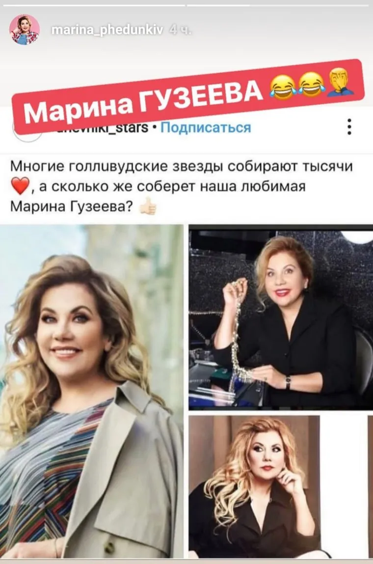 Федункив выложила скриншот страницы со своими фотографиями. Снимки сопровождались надписью: «Многие голливудские звезды собирают тысячи лайков. А сколько соберет наша любимая Марина Гузеева». Имя автора поста 45-летняя актриса закрыла смеющимися смайликами.