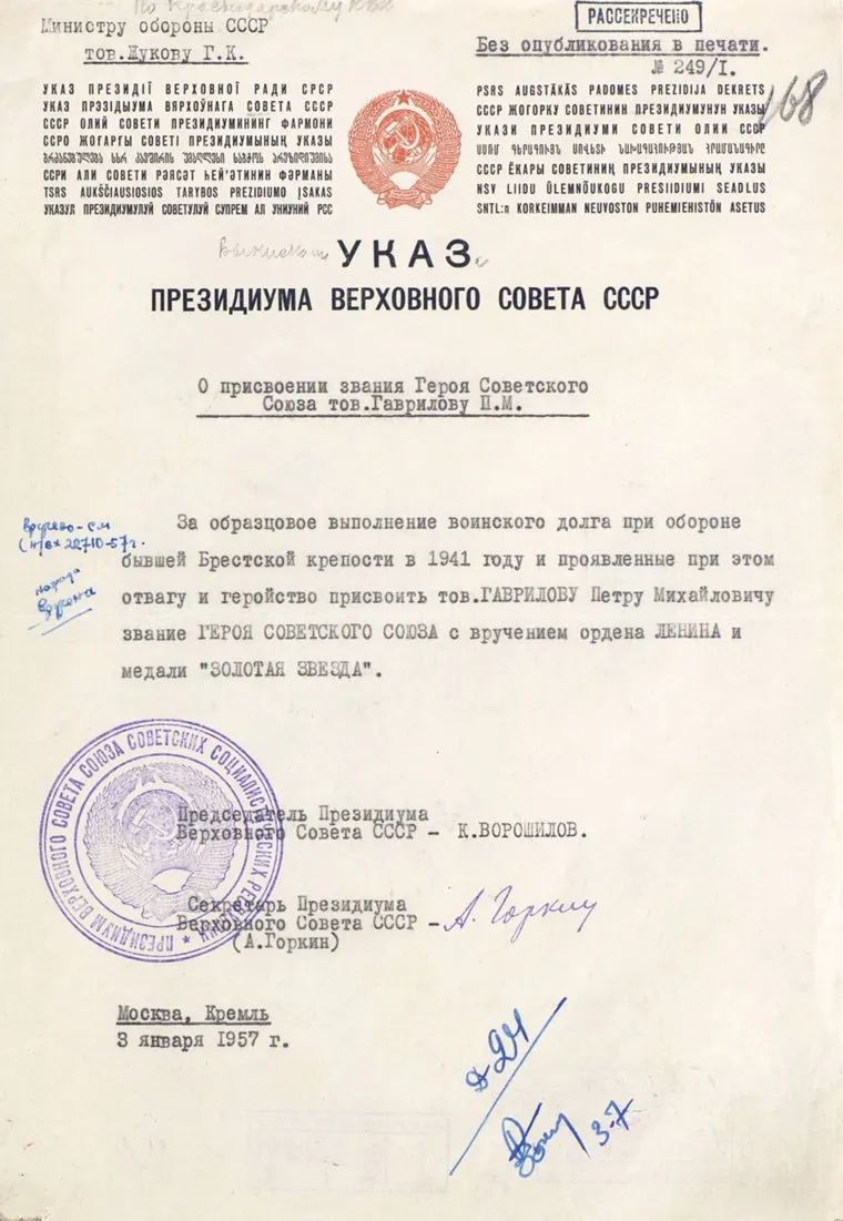 Министерство обороны России в канун 78-й годовщины начала Великой Отечественной войны опубликовало рассекреченные документы о защите Брестской крепости. Указы и наградные листы размещены на официальном сайте ведомства.