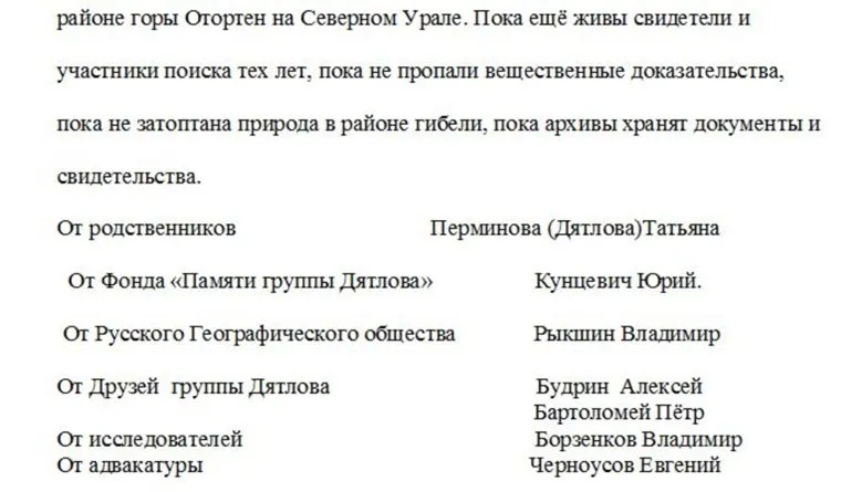 Подписанты просят следственный комитет возобновить расследование уголовного дела о гибели туристов-дятловцев, прекращенное в 1959 году. «Пока еще живы свидетели и участника поиска тех лет, пока не пропали вещественные доказательства, пока не затоптана природа в районе гибели, пока архивы хранят документы и свидетельства», — говорится в письме.