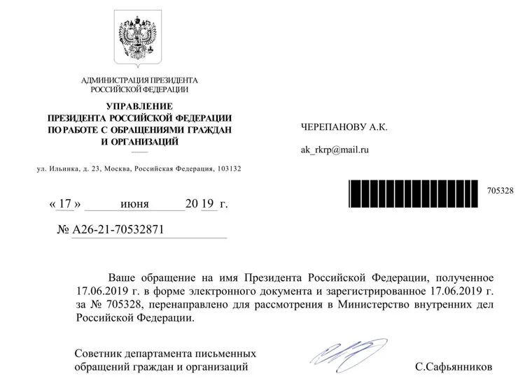 Глава тюменских коммунистов сообщил «URA.RU», что из администрации президента РФ ему пришел ответ о том, что его обращение получено и перенаправлено для рассмотрения министру внутренних дел России Владимиру Колокольцеву (см. скан). Как пояснил агентству Черепанов, на территории ЛДНР граждан республик только готовят к получению российских паспортов: тех, кто подготовил документы, везут автобусами на территорию РФ в отделы Управления миграционной службы при МВД, где и происходит оформление и последующая выдача паспортов.