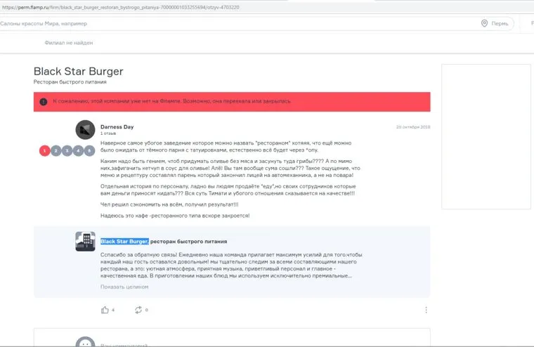 На сервисе отзывов flamp.ru пользователи оставили негативные отзывы о качестве еды в пермском ресторане Black Star Burger. «Наверное, самое убогое заведение, которое можно назвать „рестораном“. Каким надо быть гением, чтоб придумать оливье без мяса и засунуть туда грибы? А помимо них зафигачить кетчуп в соус для оливье!» — написал один из покупателей.