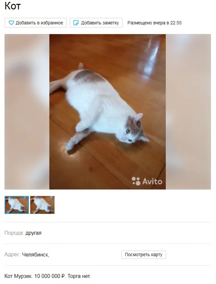 «Кот Мурзик. 10 000 000 рублей. Торга нет», — написано в объявлении жителя Челябинска. Кот имеет белую шкуру с рыжими пятнами на голове, боку и лапке. Порода не указана. Автор объявления не уточняет в тексте, почему просит за кота такую большую сумму. На вопросы журналиста «URA.RU», заданные в чате «Авито», хозяин животного не ответил.