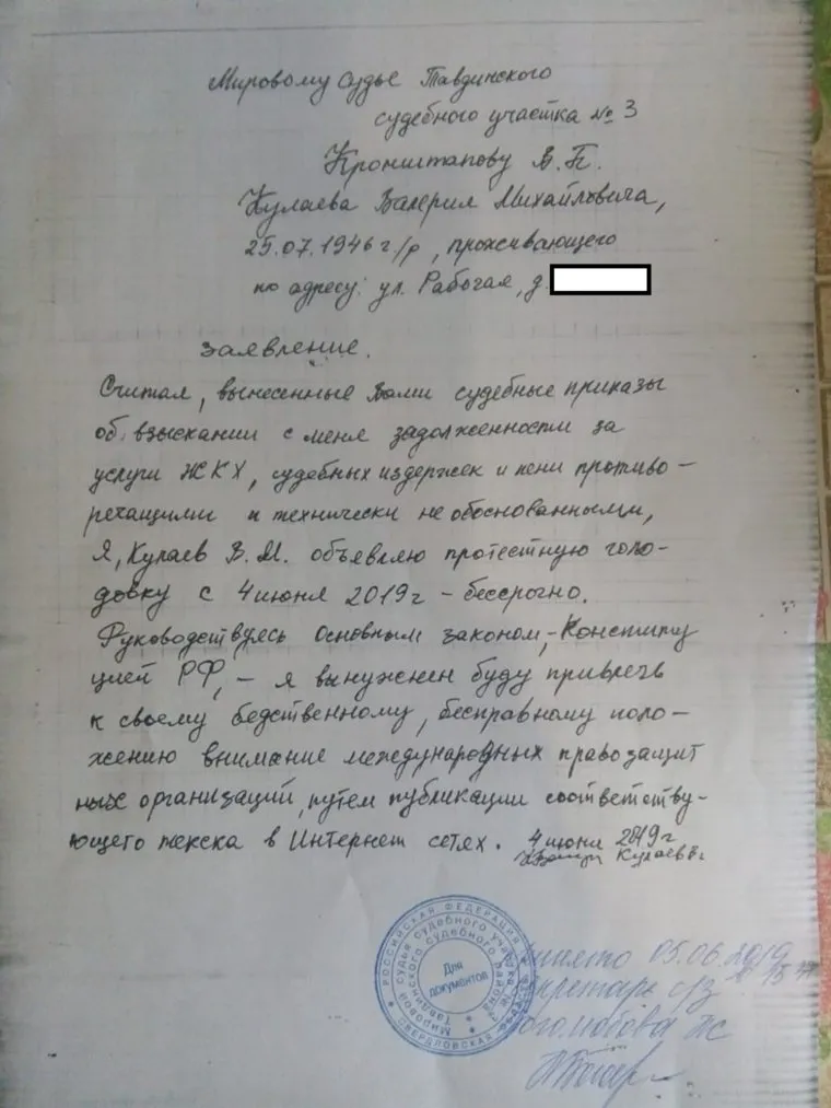 Пенсионер уведомил о начале голодовки судью Владимира Кронштапова, который принял решение о его деле. Но дальше канцелярии суда бумага не пошла