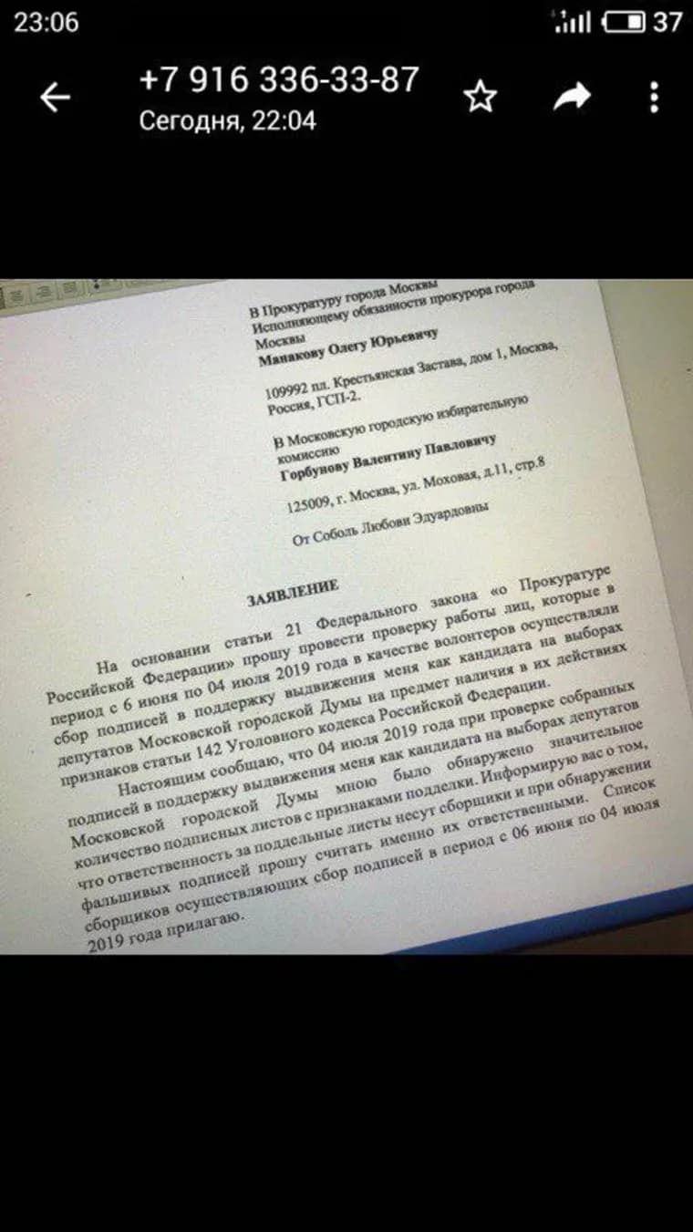 5 июля в telegram-каналах появились новые сообщения — о подделке документов. В этот раз речь идет о том, что юрист Навального готовит обращения в прокуратуру на предмет подлога избирательных документов сборщиками, чтобы скрыть фальсификацию подписей. На появившихся в соцсетях скриншотах видно, как Соболь якобы демонстрирует собеседнику в WhatsApp письмо силовикам с просьбой проверить работу волонтеров. «Не знаю, что сейчас делать. По-моему кто-то из наших сливает, — пишет кандидат. — Я никому сейчас не верю. Пусть прокуратура разбирается».
