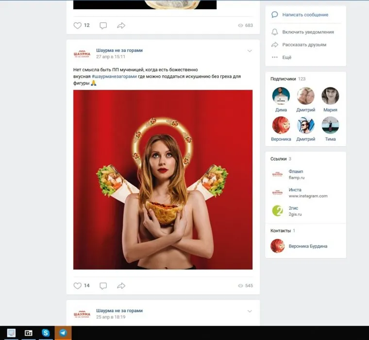 Фотография , на которой полуобнаженная модель в образе мученицы признается в любви «божественной шаурме», была размещена в социальных сетях. Ранее Вероника Бурдина призналась «URA.RU», что «ходит по грани», но старается придумывать для продвижения своего кафе «нетривиальный контент». Она также подчеркивала, что при создании рекламных образов не преследовала цели кого-то оскорбить или высмеять.
