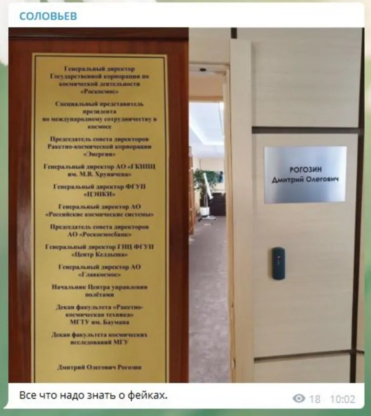 «Все, что надо знать о фейках», — написал Соловьев, прикрепив к посту фотографии с настоящей и фейковой табличками. На настоящей указаны лишь фамилия, имя и отчество главы Роскосмоса. На фейковой, которую ранее распространили в соцсетях, перечисляются 12 должностей Рогозина, от гендиректора госкорпорации «Роскосмос» до декана факультета космических исследований МГУ.