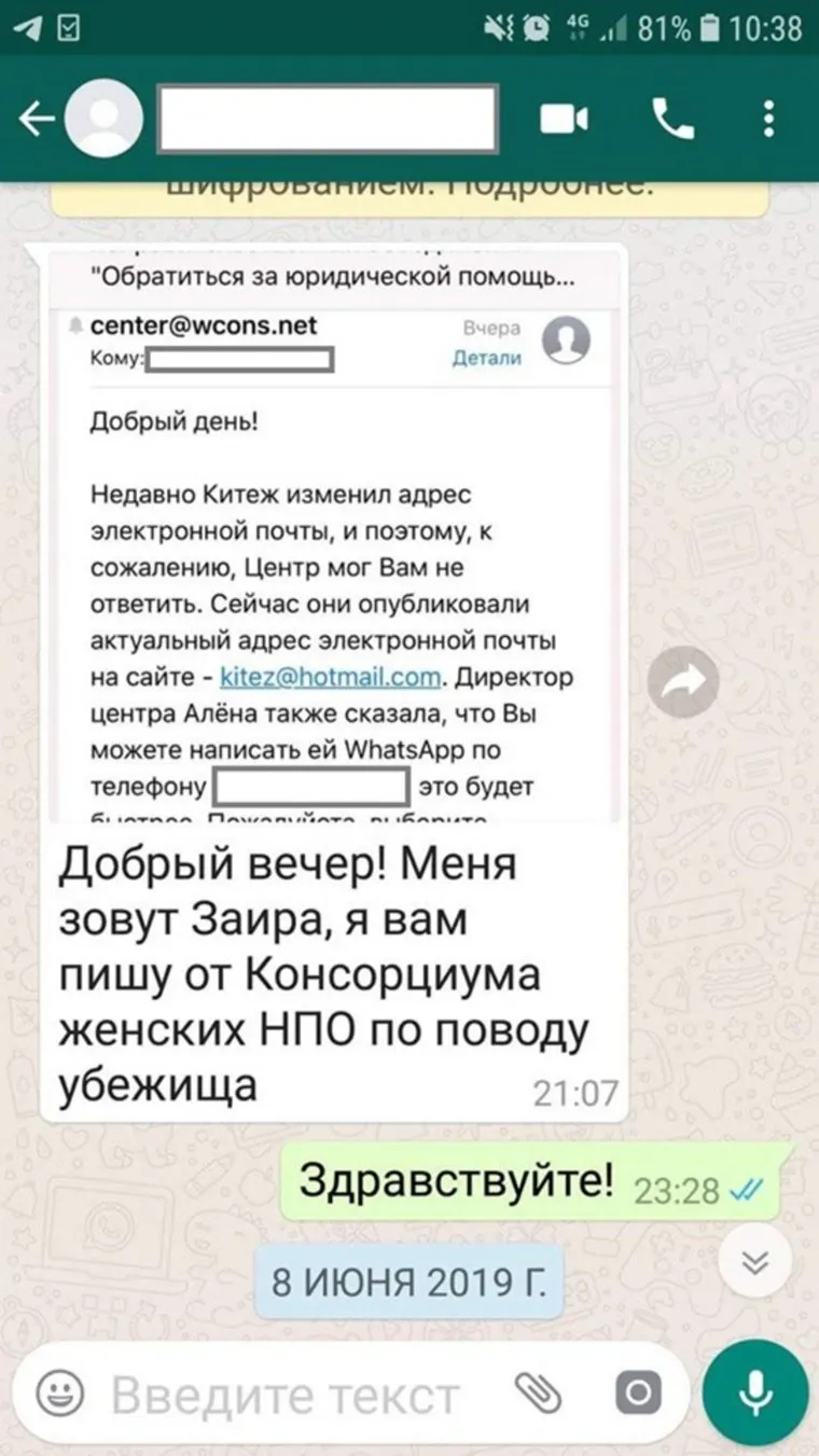 В качестве доказательств добровольного обращения к ним девушки правозащитница приводит скрины своей переписки с Заирой. В мессенджере девушка делится планами побега из дома и интересуется, как добраться до центра на метро. Кроме того, обвинения со стороны родственников Заиры в том, что центр связан с некоей группой в соцсетях, которая занимается «дискредитацией» чеченского народа и вербовкой девушек, Ельцова назвала «странными» и «абсурдными».