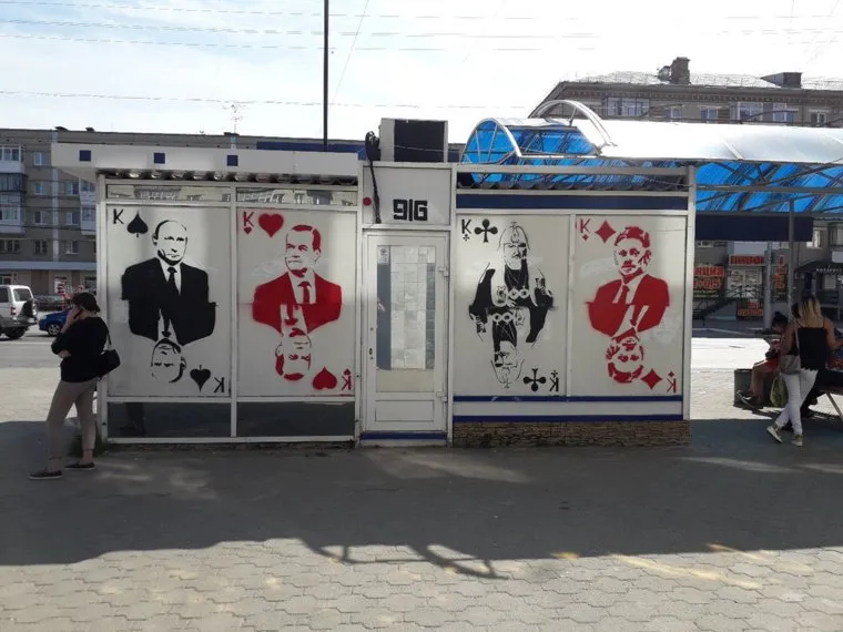 В Каменске-Уральском Свердловской области на автобусной остановке нарисовали игральные карты с портретами президента РФ Владимира Путина, премьер-министра Дмитрия Медведева, патриарха Кирилла и пресс-секретаря президента Дмитрия Пескова. Фото работы уличных художников было опубликовано в паблике «Подслушано Каменск-Уральский» «ВКонтакте».