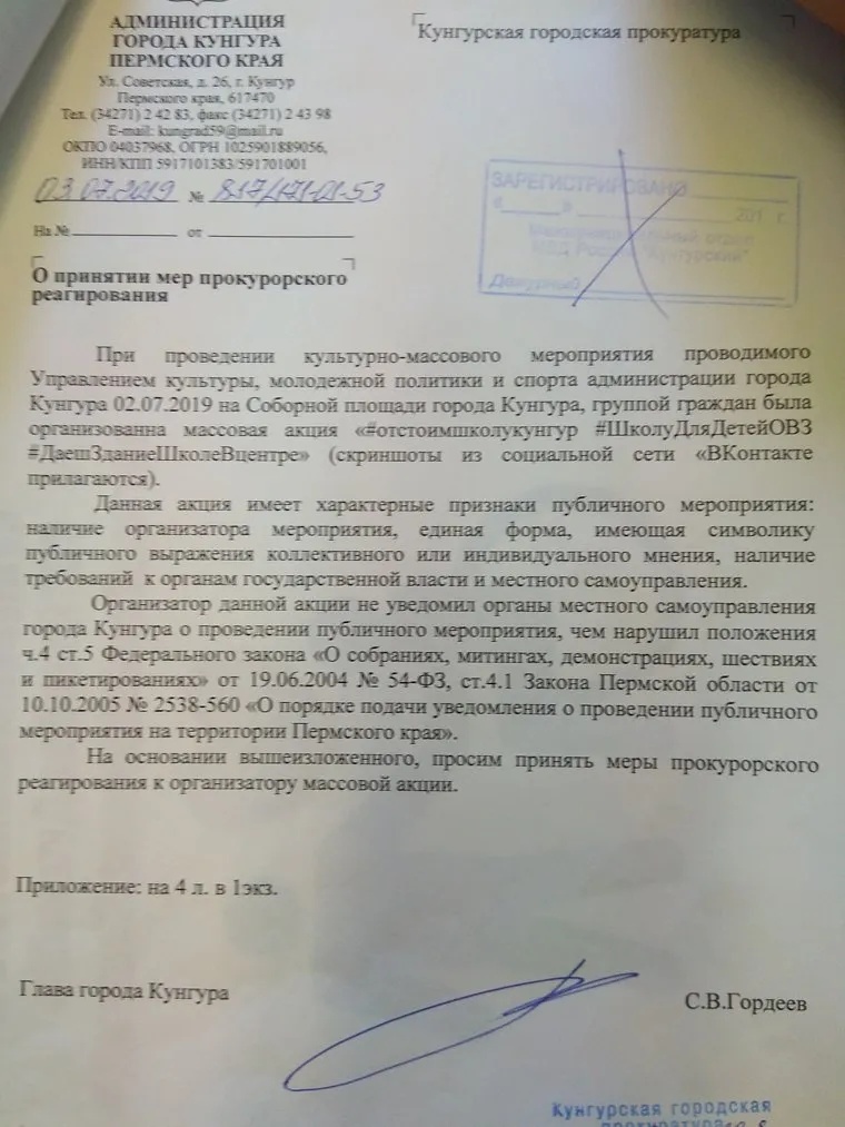 Мэр Кунгура Сергей Гордеев просит прокуратуру наказать родителей детей с ограниченными возможностями здоровья (ОВЗ) за несогласованную публичную акцию. Они пришли на городское мероприятие в одинаковых майках с хэштегами, с помощью которых можно было узнать о закрытии в городе школы для детей с ОВЗ.
