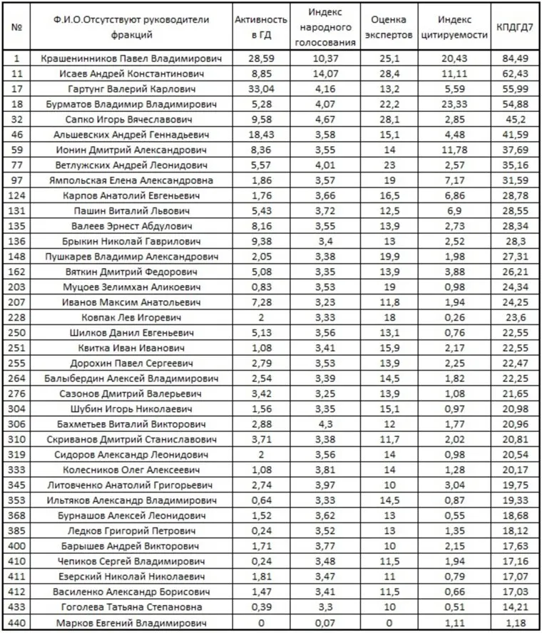 Как указывается составителями рейтинга, на итоговую позицию каждого из оцениваемых повлияли четыре критерия: результаты народного голосования, что показывает реальную возможность мобилизовать своих сторонников, индекс законотворческой активности депутата, индекс медийности и уровень экспертной оценки работы депутата в своем регионе.