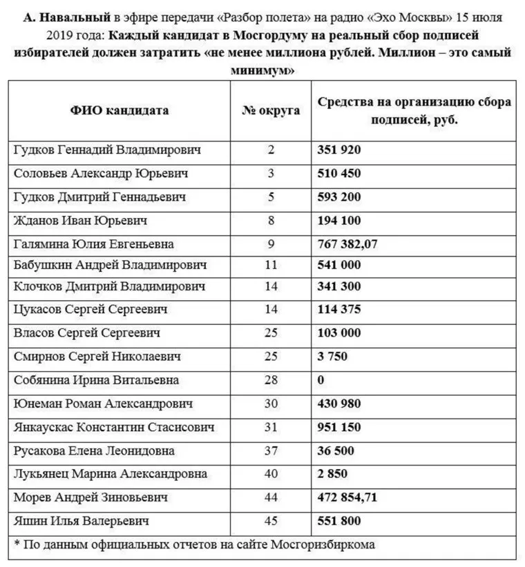 Однако, согласно официальным данным Мосгоризбиркома (МГИК), на которые ссылается Рябцева в своем telegram-канале, ни один из поддерживаемых Навальным кандидатов не потратил эту сумму. Например, Илье Яшину сбор подписей обошелся в 551,8 тысячи рублей, Дмитрию Гудкову — в 593,2 тысячи рублей, а Ивану Жданову — в 194,1 тысячи рублей. Всех их, как напоминала Рябцева, Мосгоризбирком не допустил до выборов из-за превышения брака в подписях.