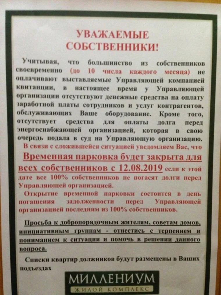 Представители УК разместили объявление о закрытии парковки с 12 августа, если к этой дате 100% собственников не погасят долги. «С нами не идут на контакт. Ведут они себя как в 90-е — разговаривают по-хамски, с явными угрозами. И это все на фоне того, что на городских порталах постоянно рекламируется этот жилой комплекс», — отметил собеседник агентства.