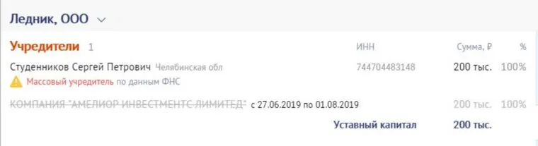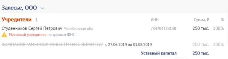 Согласно базе данных СБИС, собственником ООО «Ледник» (Челябинск) и ООО «Залесье» (Екатеринбург) числилась «АМЕЛИОР ИНВЕСТМЕНТС ЛИМИТЕД» (Кипр). Теперь их владельцем вновь стал Студенников, сохранивший прописку в Челябинске. Его жена Елена Соболева также прописанная в Челябинске, вернула из «МАСИЛОР ХОЛДИНГС ЛИМИТЕД» (Кипр) фирму «Триумф» (Трехгорный, Челябинская область).
