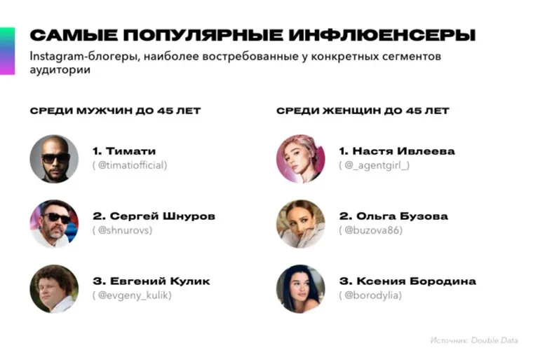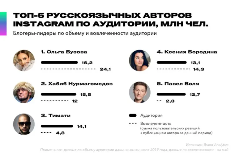По данным издания, топ-5 наиболее популярных блогеров составляют телеведущая Ольга Бузова, боец Хабиб Нурмагомедов, рэпер Тимати, соведущая Бузовой по шоу «Дом-2» Ксения Бородина и стендап-комик Павел Воля. Еще один рейтинг Forbes — топ инфлюенсеров (блогеров, ориентированных на определенный сегмент аудитории). В него входят Тимати, лидер «Ленинграда» Сергей Шнуров, а также бывший КВН-щик, актер из Екатеринбурга Евгений Кулик, телеведущая «Орла и решки» Настя Ивлеева, Ольга Бузова и Ксения Бородина.