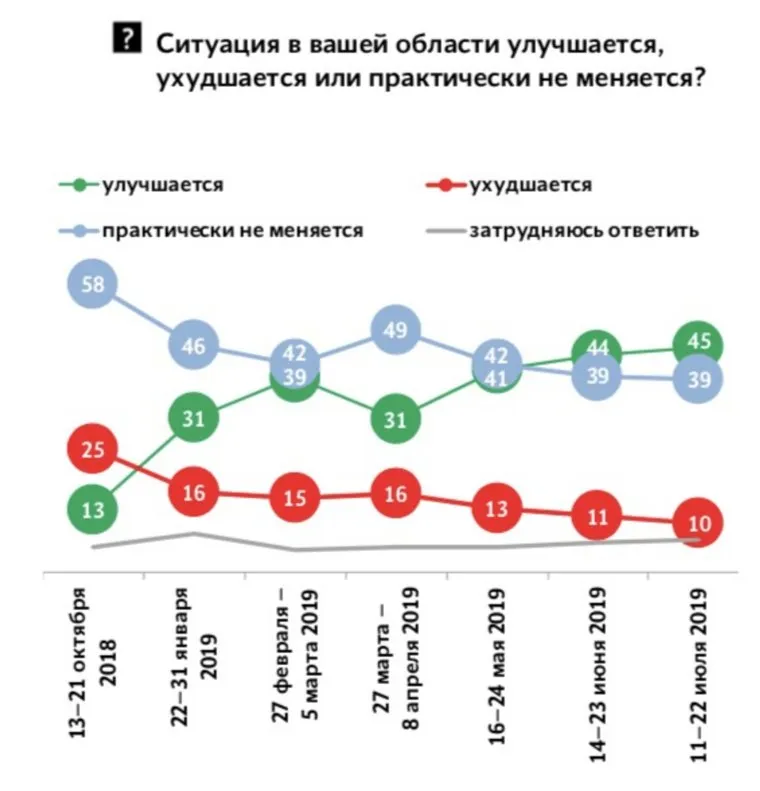 Зауральцам предложили ответить на вопрос: «Вадим Шумков работает на своем посту хорошо или плохо?» С января 2019 года число тех, кто ответил на этот вопрос «хорошо», увеличилось с 52% до 75%. Также респондентам предложили ответить на вопрос: «Ситуация в вашей области улучшается, ухудшается или фактически не меняется?». Согласно последнему опросу, 45% жителей считают, что ситуация в области улучшается. Сразу после назначения Шумкова оптимистично настроенных зауральцев было втрое меньше — всего 13%.