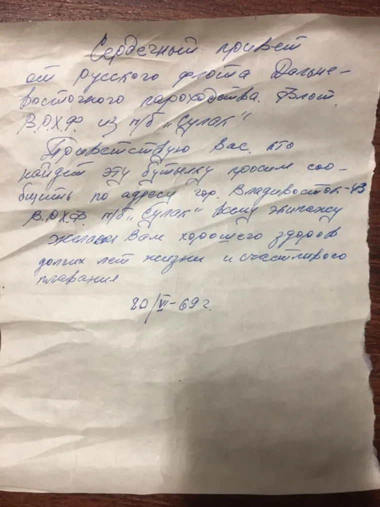 Записка датирована 20 июня 1969 года. «Сердечный привет от Русского флота Дальневосточного пароходства. Флот В. Р. Х. Ф. из п/б „Сулак“. Приветствую Вас, кто найдет эту бутылку, просим сообщить по адресу: Владивосток-43 В. Р. Х. Ф. из п/б „Сулак“ всему экипажу», — говорится в послании.