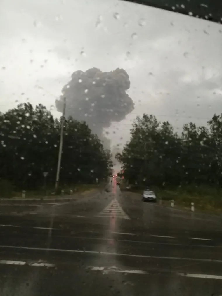 На видео запечатлены множественные удары молний и взрыв, который гремит на горизонте. Спустя несколько секунд зарево исчезает и разгорается пожар. Очевидцы активно комментируют происходящее в соцсети.