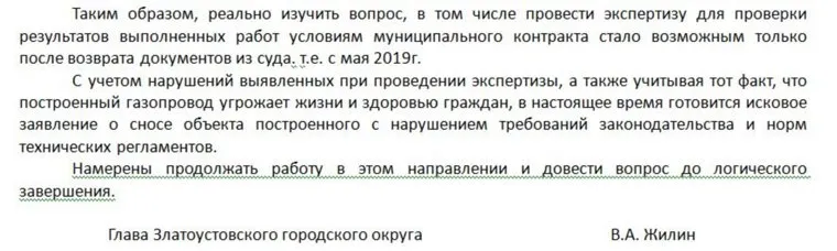 Как говорится в письме, объект построен с нарушениями. «Газопровод угрожает жизни и здоровью граждан, готовится исковое заявление о сносе», — сообщается в письме, которое, как утверждает Агазамов, должен подписать мэр.