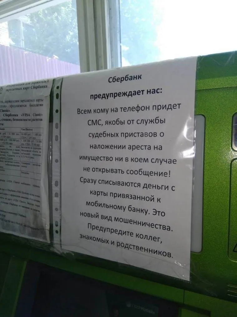 «Сбербанк предупреждает нас: всем кому придет СМС, якобы от службы судебных приставов о наложении ареста на имущество ни в коем случае не открывать сообщение! Сразу списываются деньги с карты привязанной к мобильному банку», — сообщается в объявлении (орфография и пунктуация сохранена, — прим. ред.).