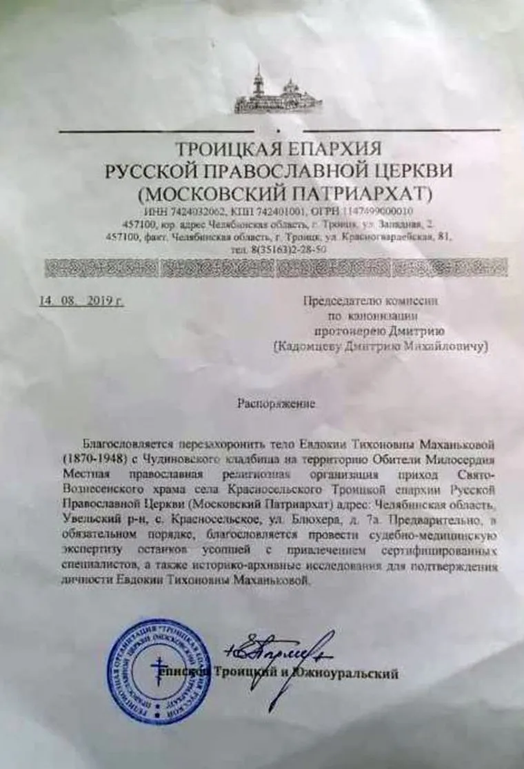 В Челябинской епархии назвали «безосновательной и недопустимой» попытку вывезти останки местночтимой святой Евдокии Чудиновской (Дунюшки) в Октябрьском районе, предпринятую по инициативе возглавляющего соседнюю Троицкую епархию епископа Пармена. Об этом заявили в пресс-службе епархии.