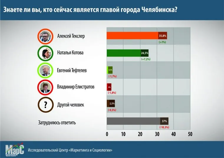 Экс-мэр Владимир Елистратов подал в отставку 24 июня. На сегодня 35,8% опрошенных горожан — плюс 7% с момента проведения июльского опроса — считают его преемником Текслера. Еще 37% затруднились с ответом, а почти четверть опрошенных знают, что в действительности этот пост занимает Котова. Таких стало на 7,2% больше, чем в июле.