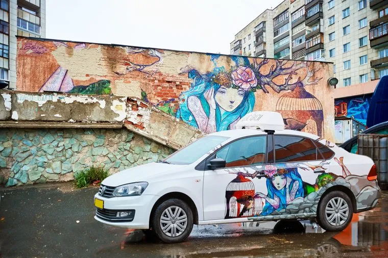 На машины партнеров сервиса «Яндекс.Такси» в Екатеринбурге нанесли работы уличных художников — участников фестиваля «STENOGRAFFIA». Перенести известные горожанам граффити на автомобили решили авторы проекта «Двигаем искусство».