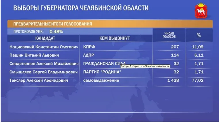 На момент подготовки новости было обработано 0,48% бюллетеней. На долю Текслера приходится 77,02% голосов, претендент от КПРФ Константин Нациевский получил 11,09%. Депутат Госдумы от ЛДПР Виталий Пашин набрал 6,11%, бизнесмен Сергей Смышляев («Родина») и экс-омбудсмен региона Алексей Севастьянов — 1,71% каждый.