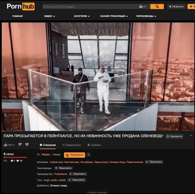 «Видео было залито под названием „Пара просыпается в пентхаусе, но их невинность уже продана“», — пишет . Пользователь поставил категории: грубый секс, жесткий секс и секс на публике. Видеоролик продолжает собирать большое количество дизлайков.