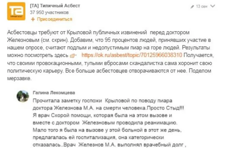 «Этот паблик принадлежит „Единой России“, комбинату „УралАсбест“ и администрации города, — заявила в свою очередь „URA.RU“ Наталья Крылова. — Я и люди, которые за меня заступаются, в этом паблике заблокированы. Но я не жалуюсь: я тоже оппонентов блокирую. К тому же я не обвиняла врача в смерти женщины — я лишь озвучила факт, что женщина умерла после приема у депутата-кардиолога и что ему выгодна платная медицина: он на этом зарабатывает».