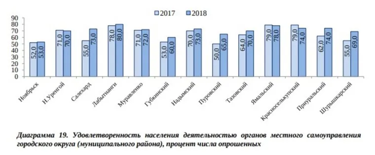 В докладе сравнивалась результативность 13 муниципалитетов по девяти различным показателям. Помимо оценки ситуации в сферах культуры, образования, спорта и экономического развития, в отчете анализируется уровень удовлетворенности населения деятельностью администраций. «Лучшие оценки местной власти дают жители Ямальского (78%), Приуральского и Красноселькупского (74%) районов, а также Лабытнанги (80%) и Салехарда (73%). Самые низкие показатели удовлетворенности деятельностью органов местного самоуправления в ЯНАО в Ноябрьске (53%), Губкинском (60%), в Пуровском (65%) и Шурышкарском (69%) районах», — говорится в докладе.