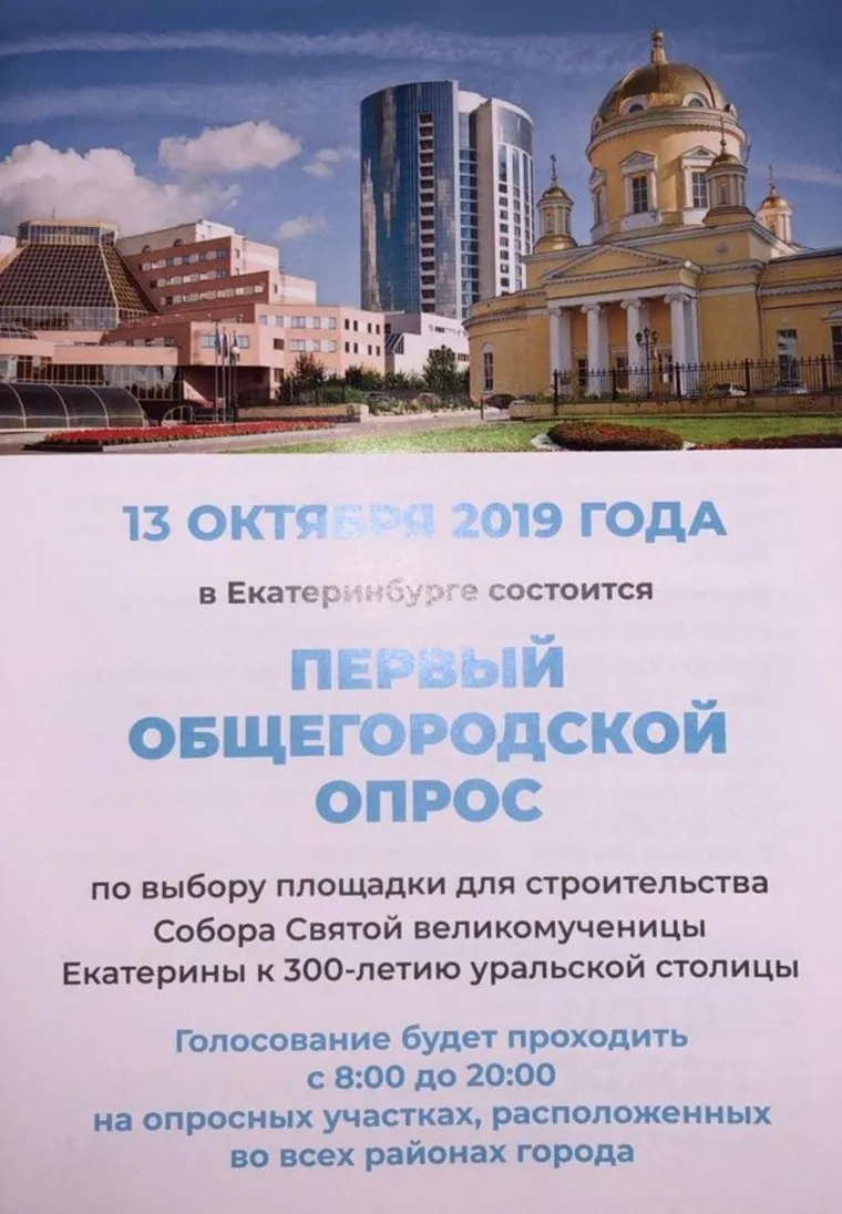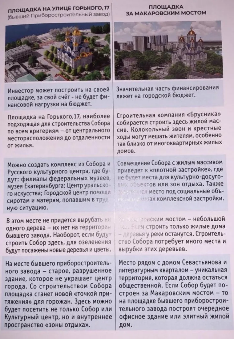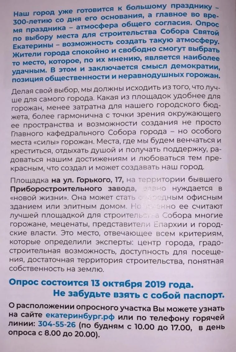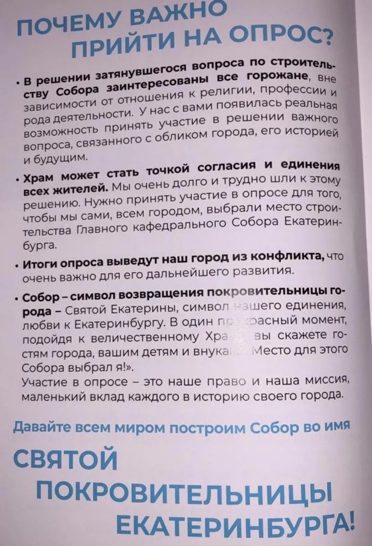 «В один прекрасный момент, подойдя к величественному Храму, вы скажете гостям города, вашим детям и внукам: место для этого Собора выбрал я!», — говорится в брошюре. Получить комментарий у руководителя аппарата администрации Екатеринбурга Ильи Захарова не удалось.